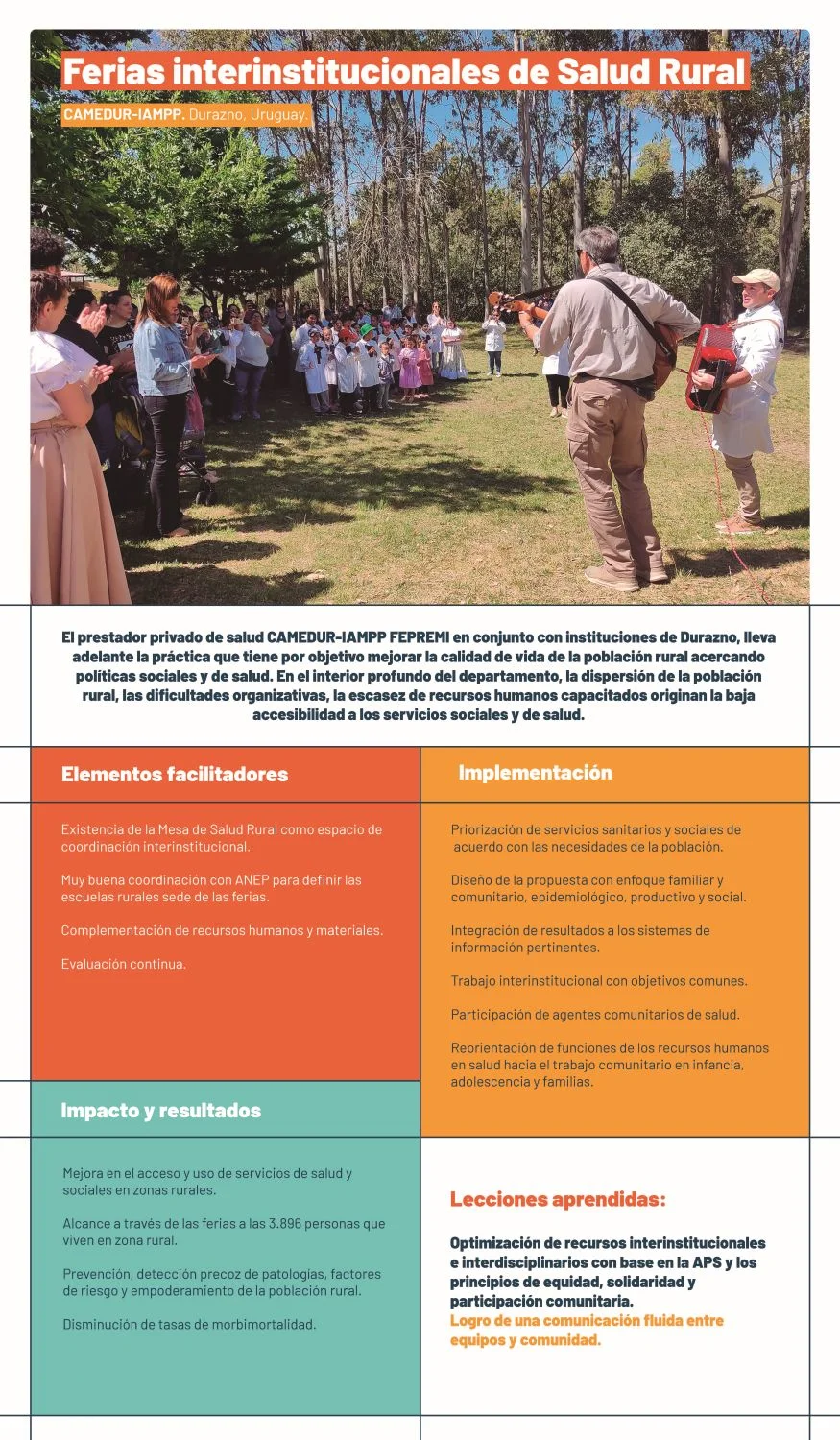 Dicha distinción es otorgado por el Nodo de Inteligencia Sanitaria del Uruguay (NISU), Ministerio de Salud Pública (MSP), Uruguay Presidencia, Agencia Uruguay de Cooperación Internacional (AUCI), y la Organización Panamericana de la Salud (OPS/OMS) con apoyo de Naciones Unidas, con el trabajo de las Ferias de Salud Rural titulado: